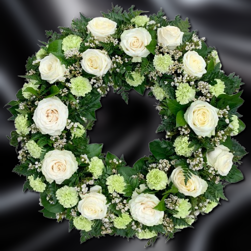 Coroana Funerara Trandafiri Albi Si Garoafe Verzi