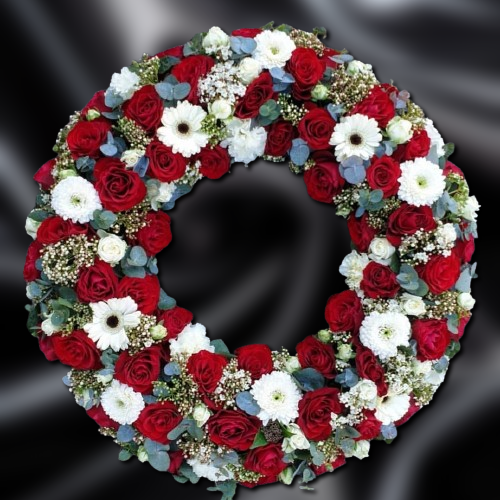 Coroana Funerara Trandafiri Rosii Si Gerbera Alba cu diametru de 70 cm