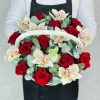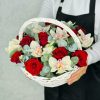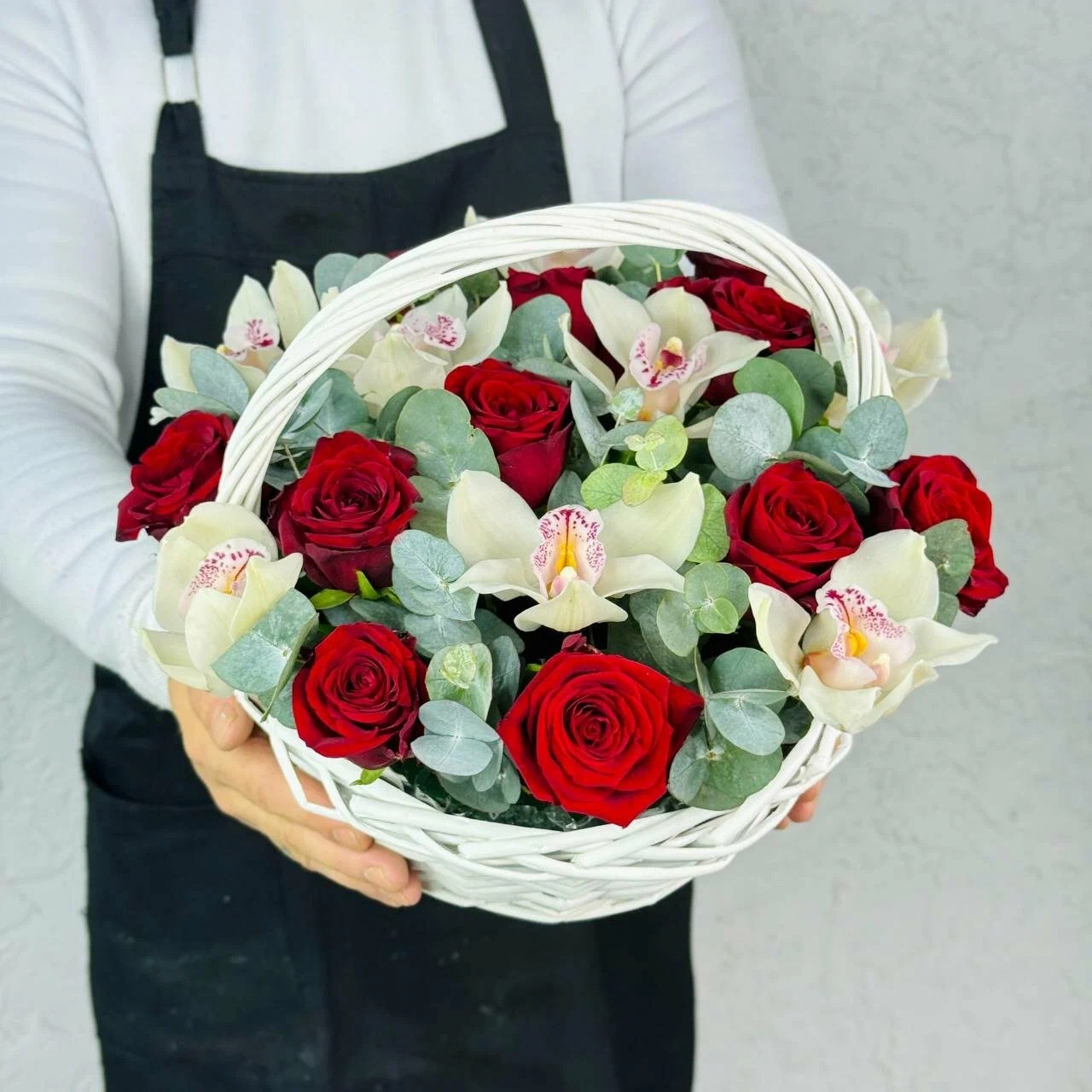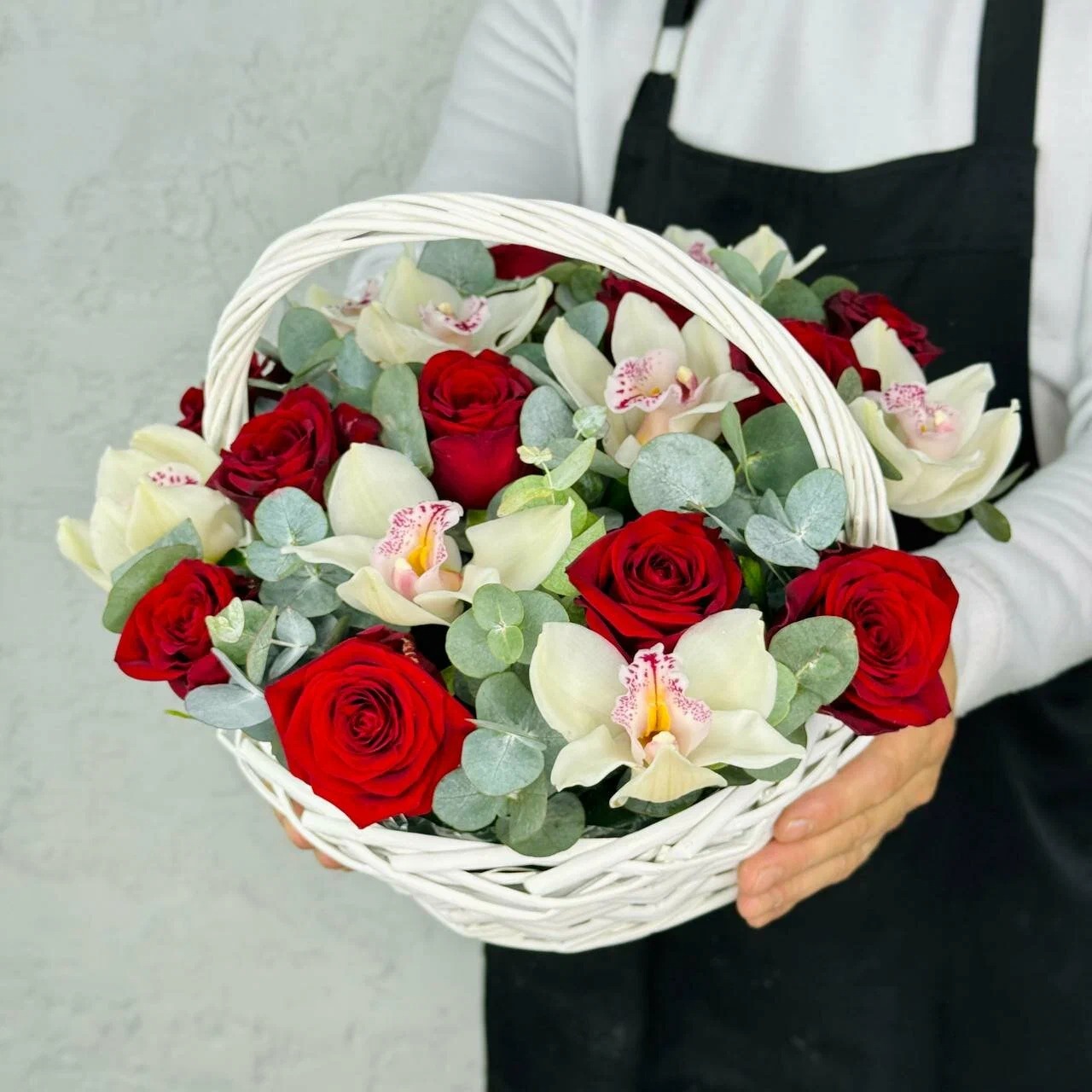 Trandafiri roșii: 11 fire Orhidee albă Cymbidium: 8 cupe Frunze de eucalipt: 11 fire Coș alb împletit: 1 bucată Burete mineral pentru hidratare (Oasis)
