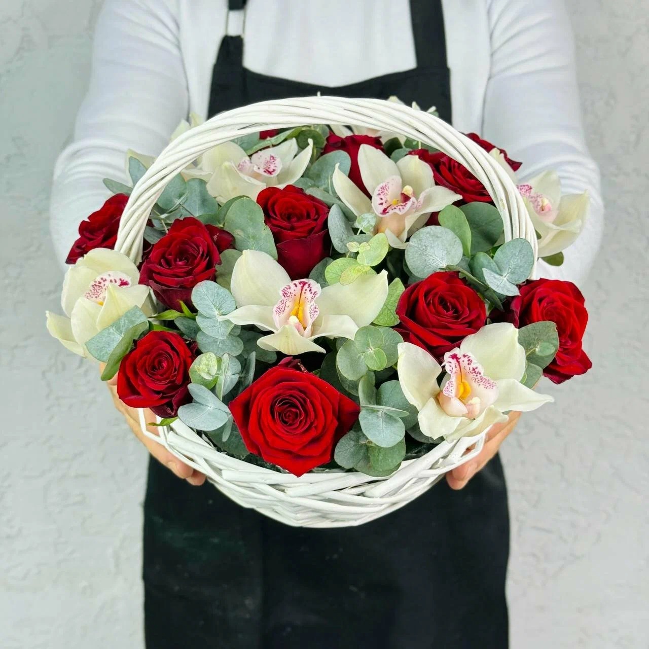 Coș Alb cu Trandafiri Roșii, Orhidee Albe și Eucalipt – Eleganță Supremă