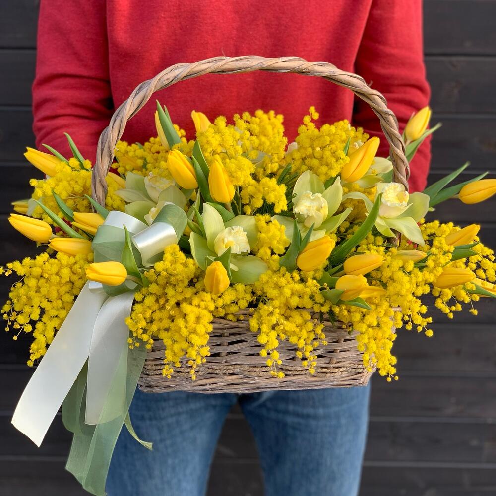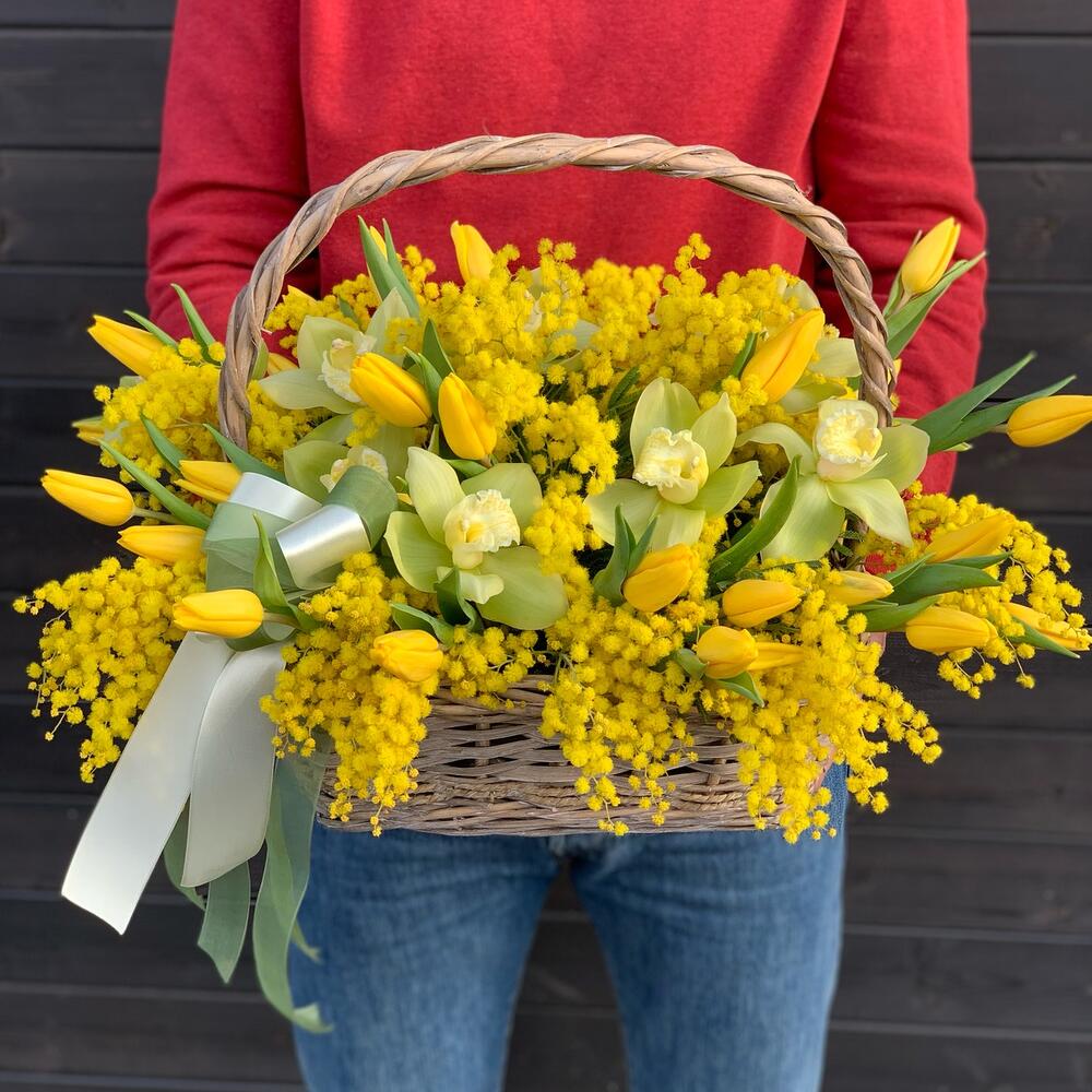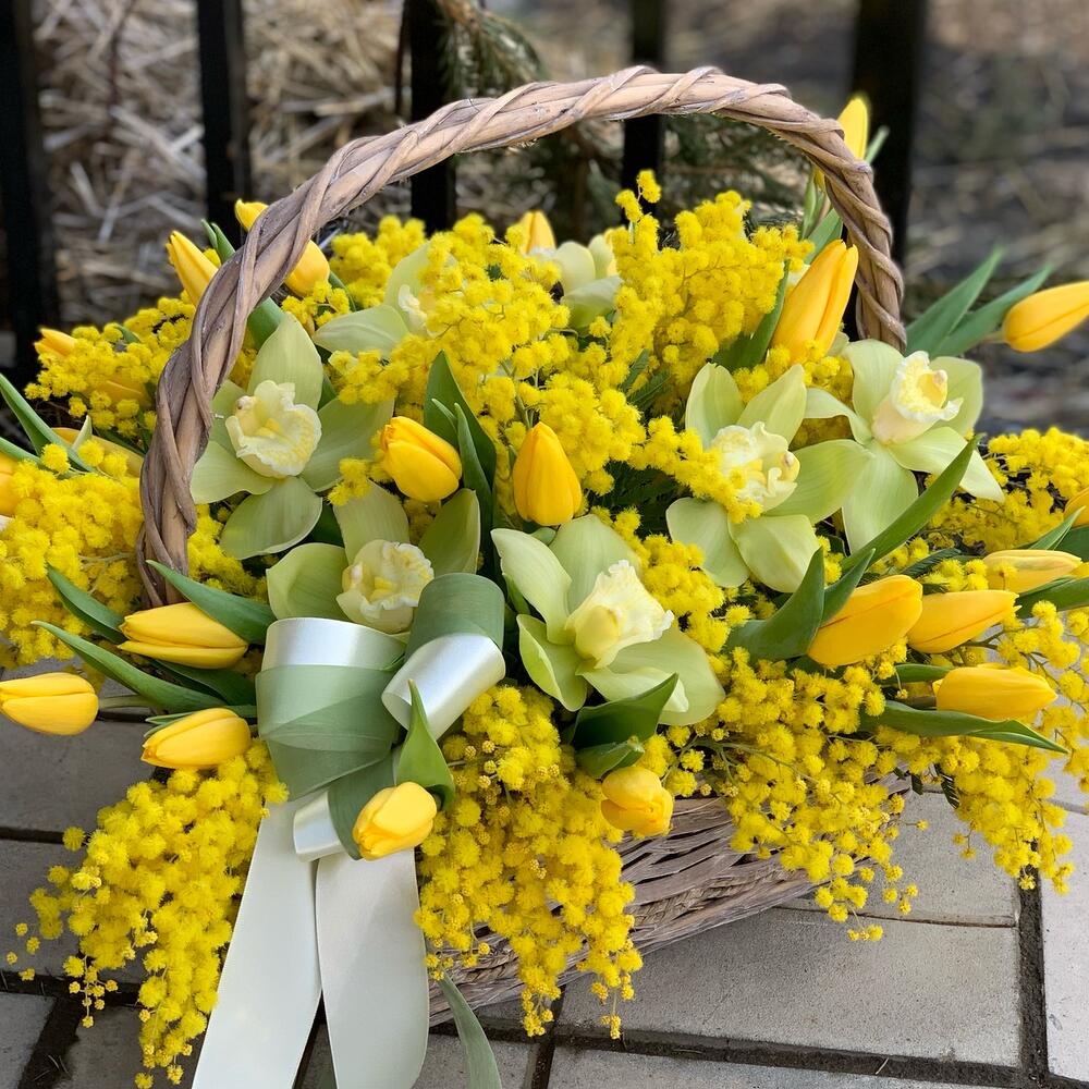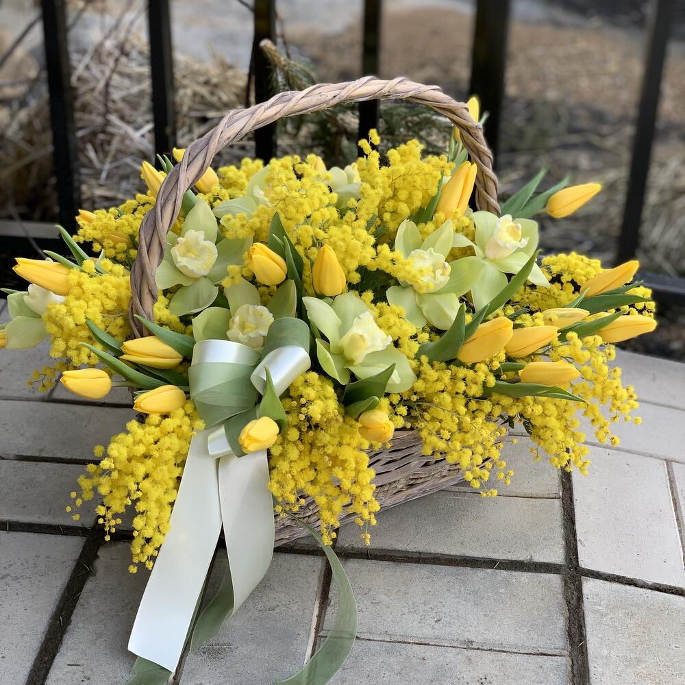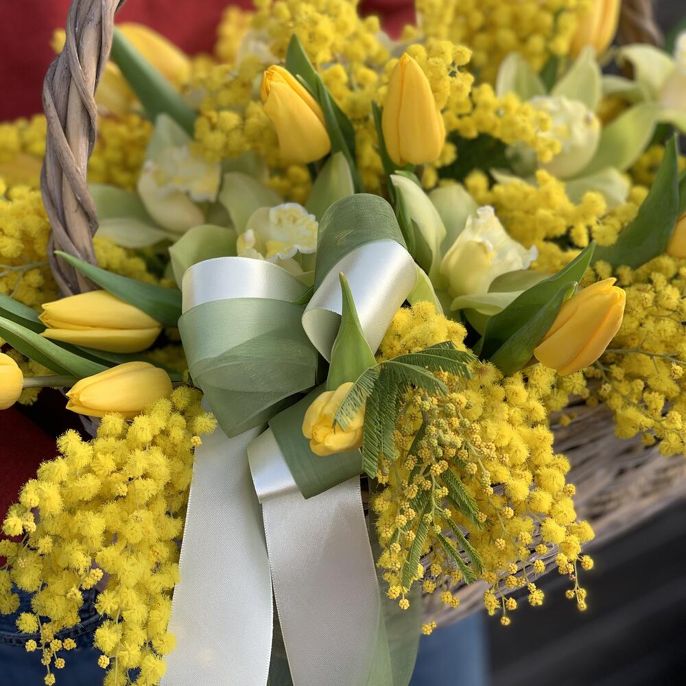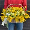 Coș Floral Elegant cu Lalele Galbene, Mimosa și Orhidee Cymbidium