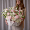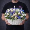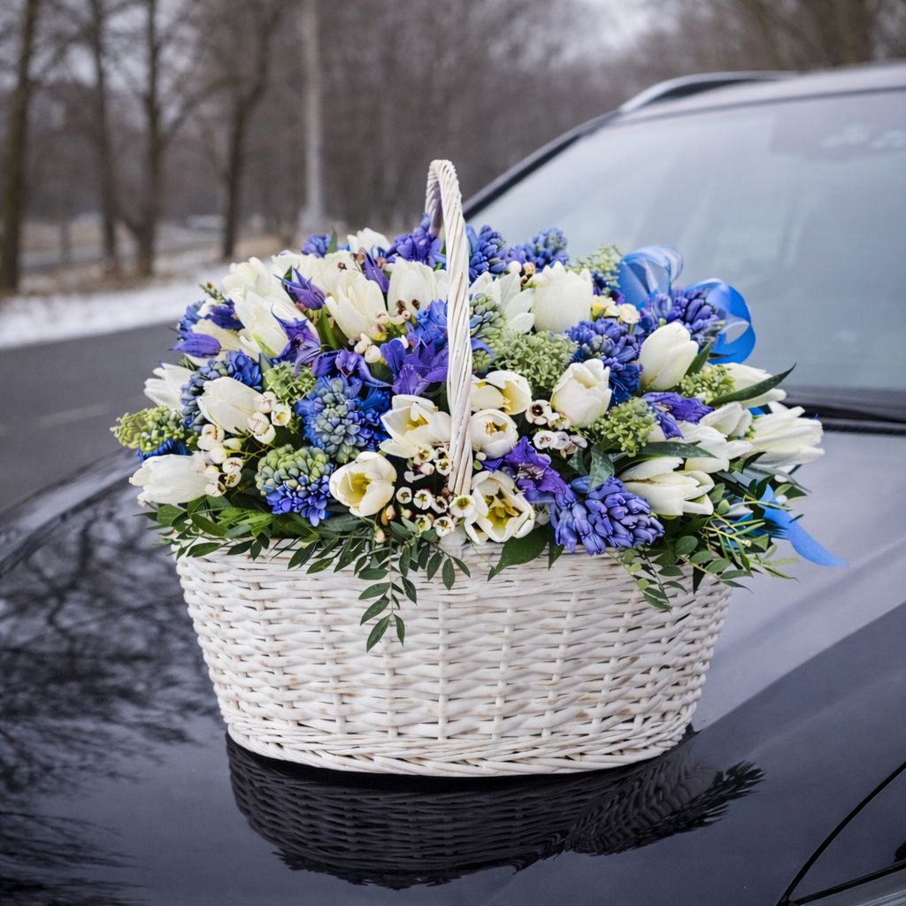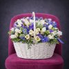 Un aranjament floral spectaculos, creat pentru a impresiona din primul moment. Acest coș floral de primăvară îmbină armonios prospețimea lalelelor albe cu parfumul intens al zambilelor albastre, completate de accente delicate de muscari și waxflower. Așezate într-un coș alb împletit de dimensiune mare, florile creează un efect elegant, natural și rafinat.