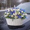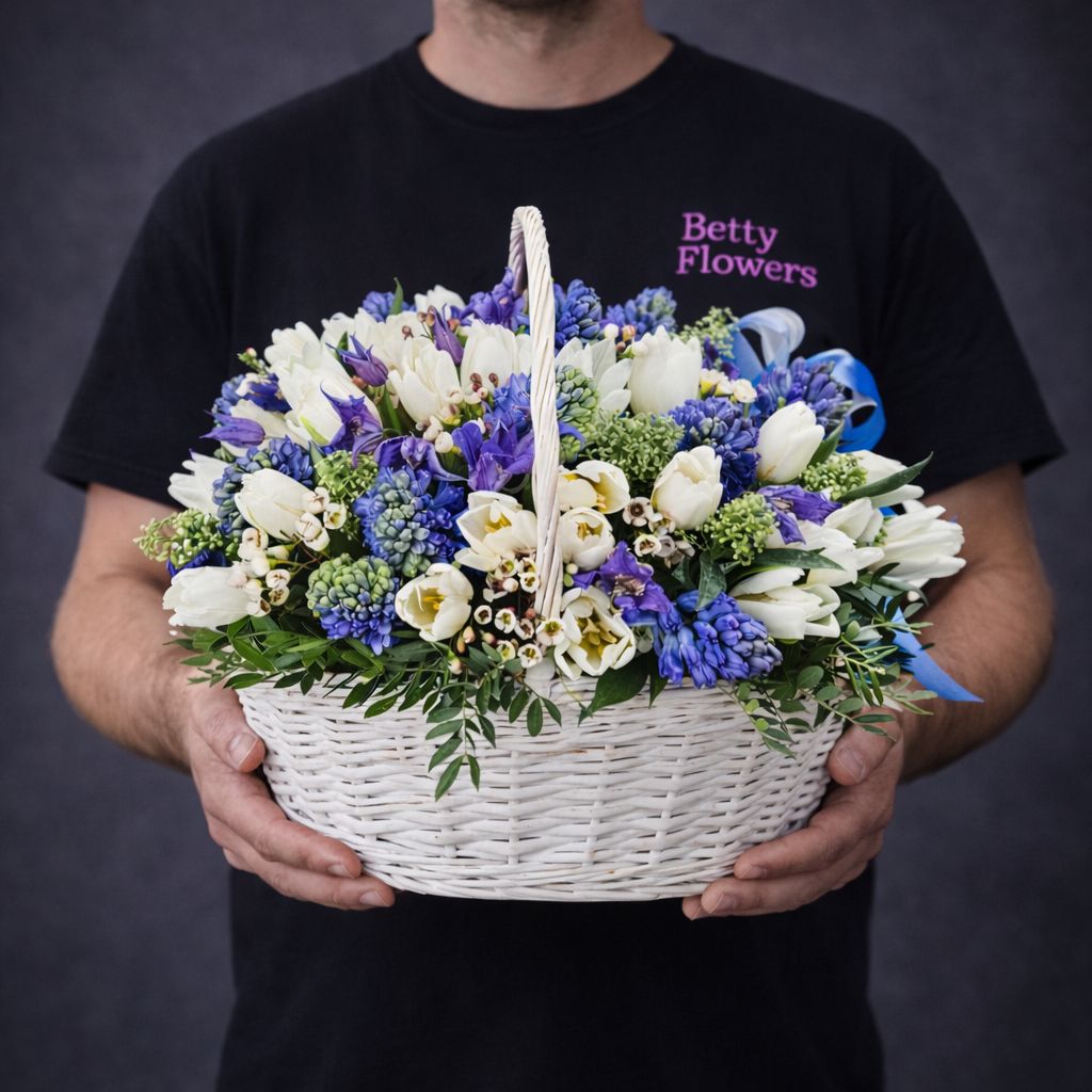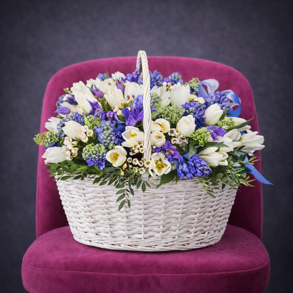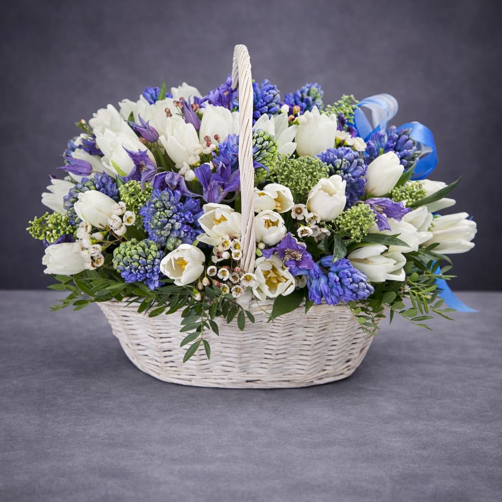 Coș Floral Elegant de Primăvară cu Lalele Albe și Zambile Albastre