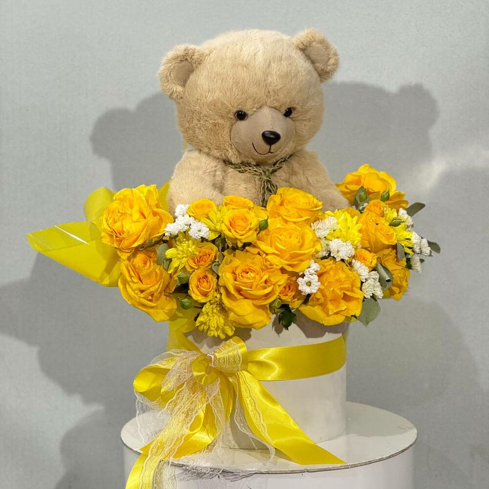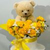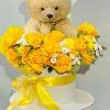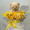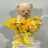 Descriere produs – Cutie crem cu ursuleț și aranjament floral în nuanțe de galben