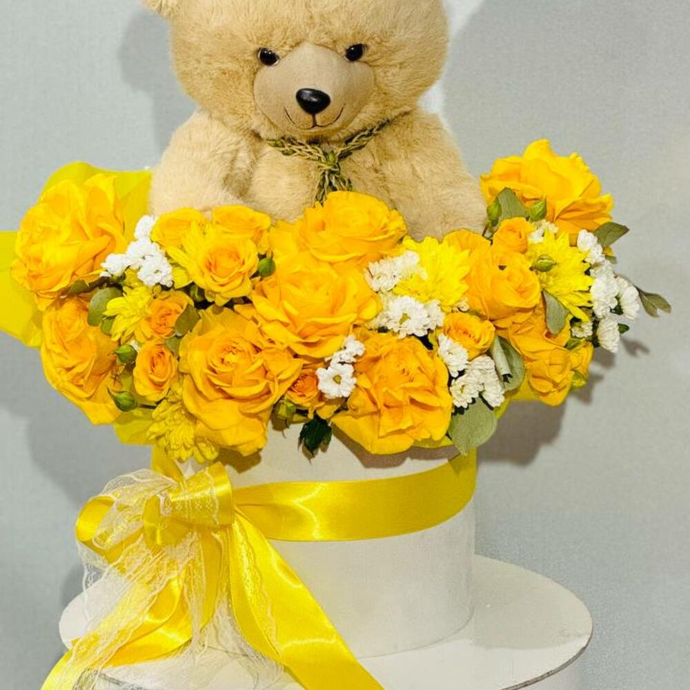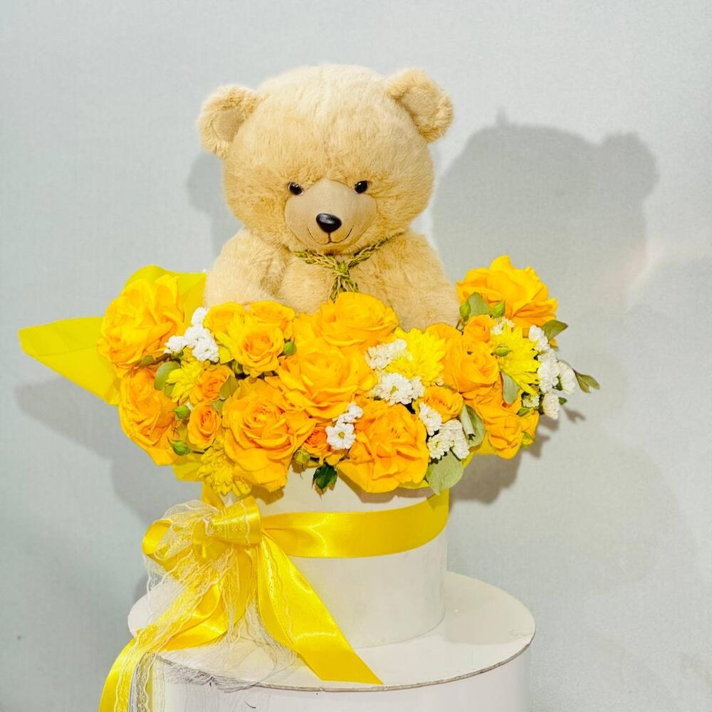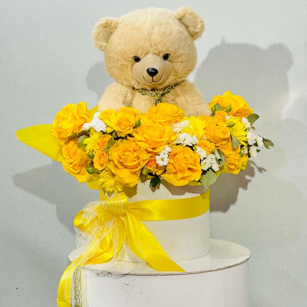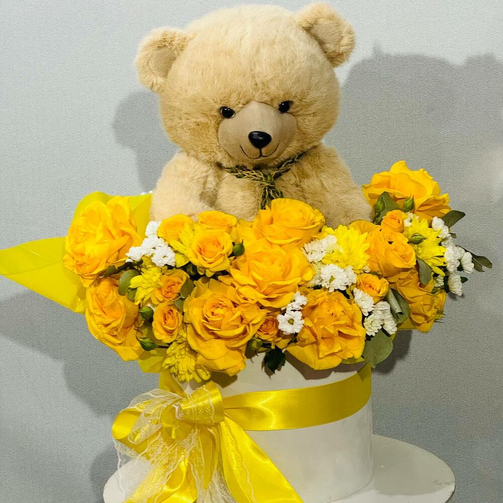 Adaugă un strop de lumină și căldură în orice moment special cu acest aranjament floral spectaculos, prezentat într-o cutie elegantă crem și completat de un ursuleț de pluș adorabil. Un cadou perfect pentru aniversări, onomastici, surprize romantice sau simple gesturi de apreciere.