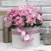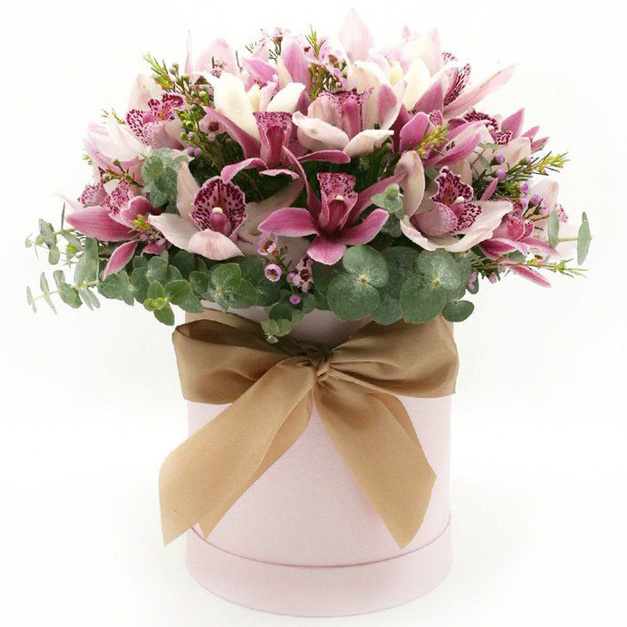 Aranjamentul floral deosebit din cumbidium si eucoalipt in cutie sub forma de palarie, de la Betty Flowers.