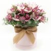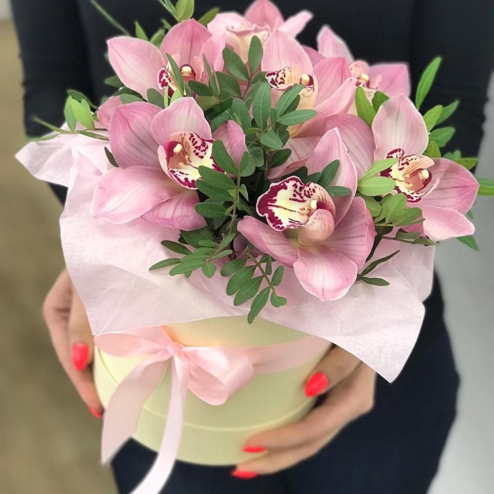 Aranjament cu cymbidium roz in cutie si verdeata decorativa.