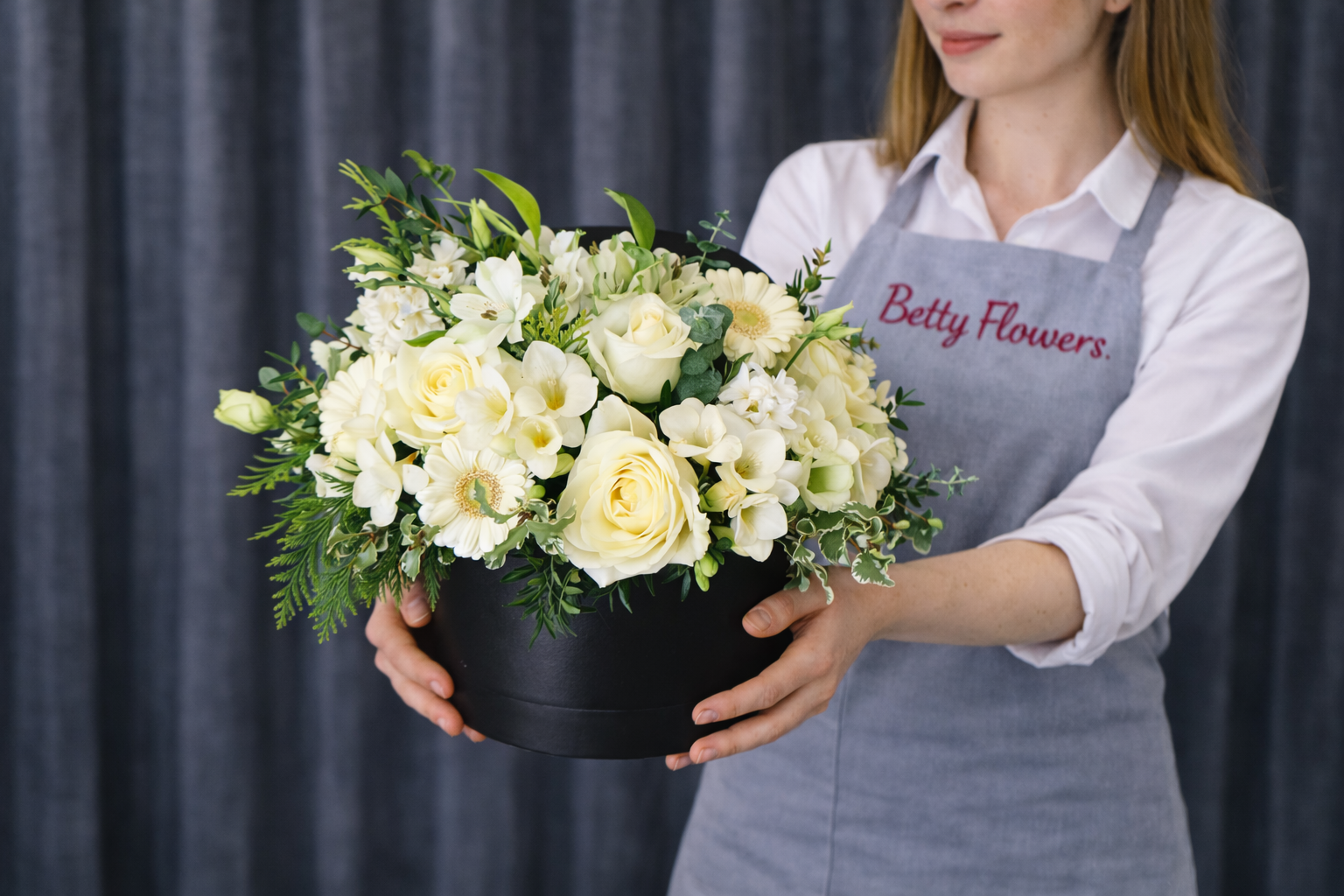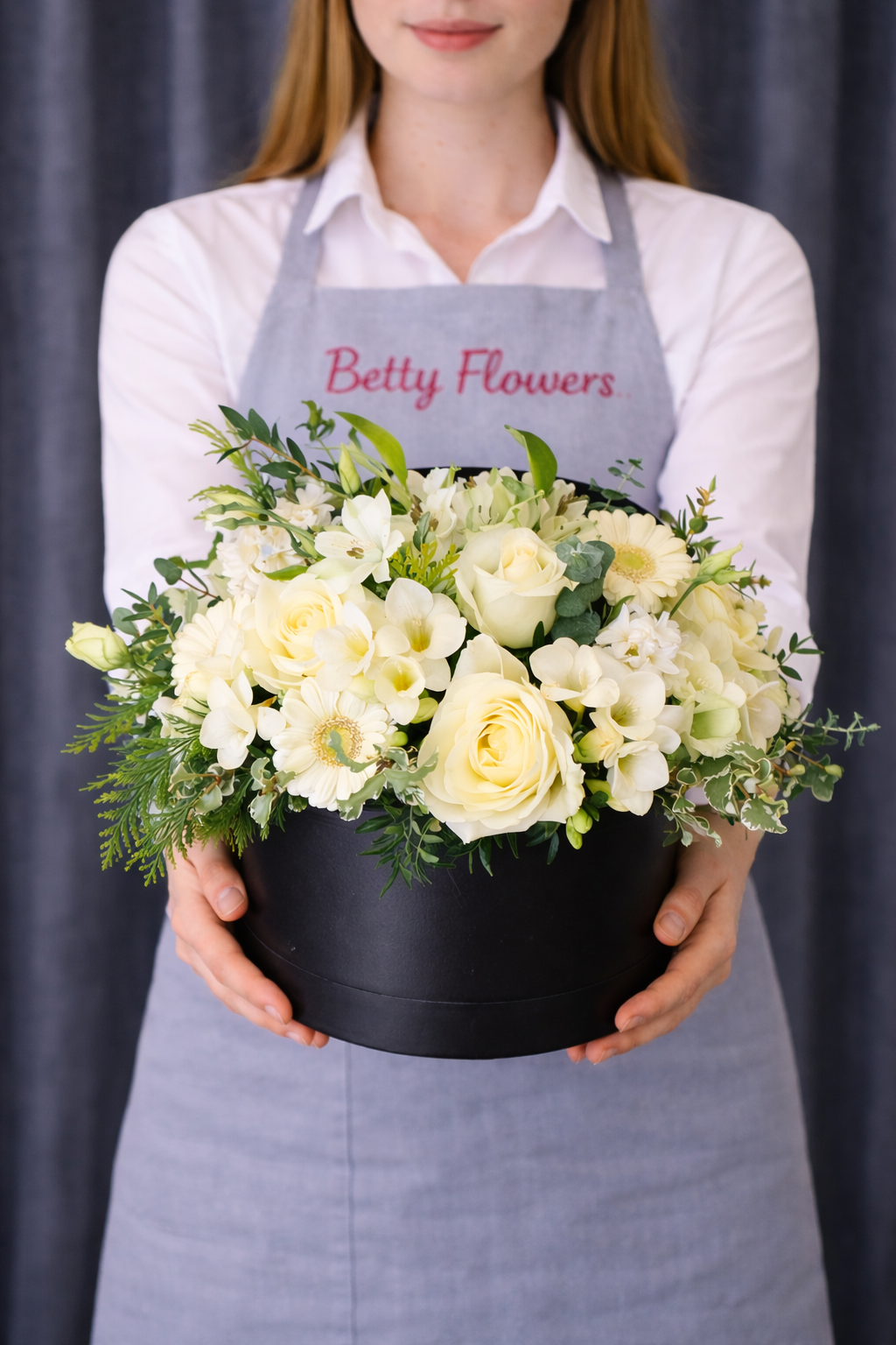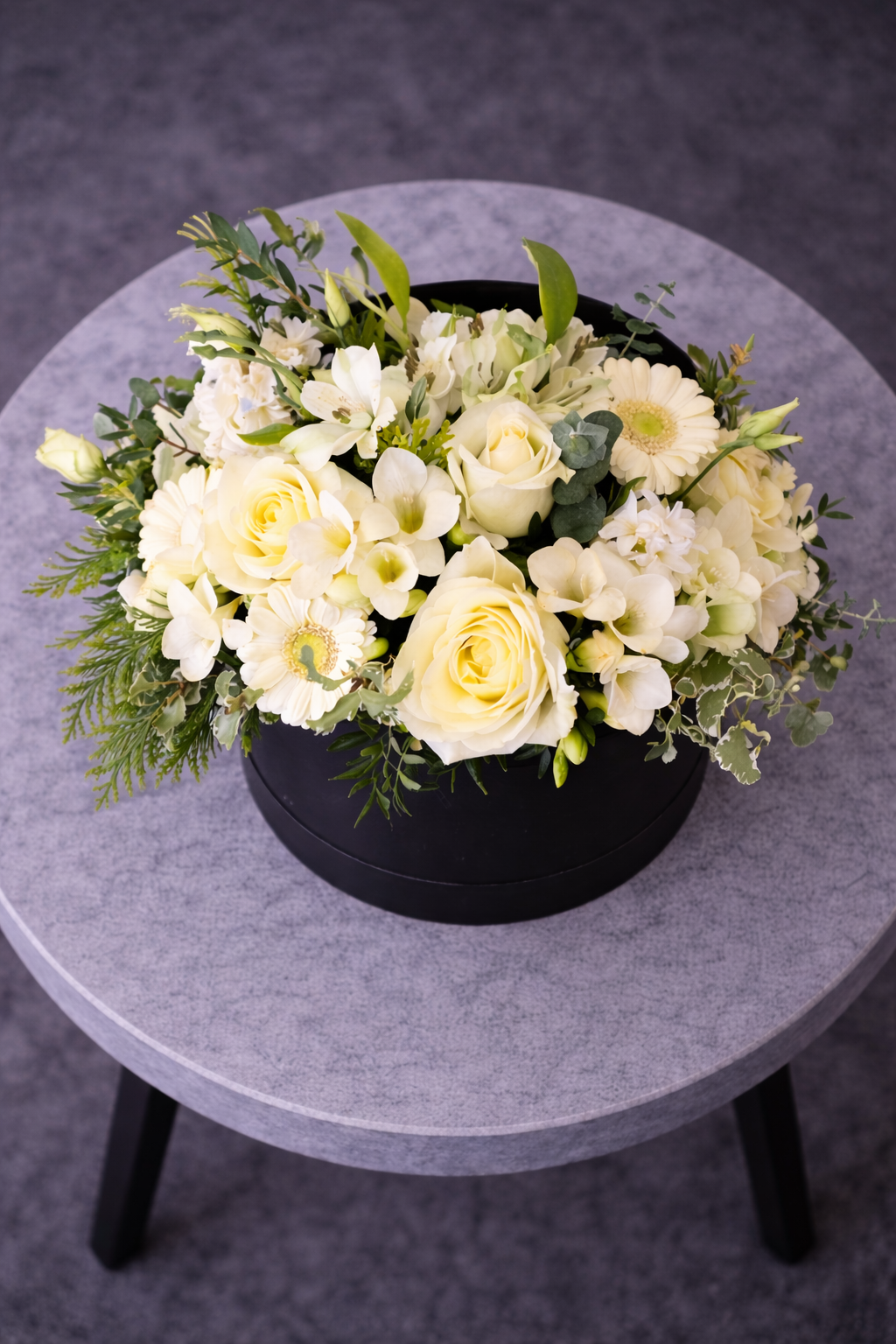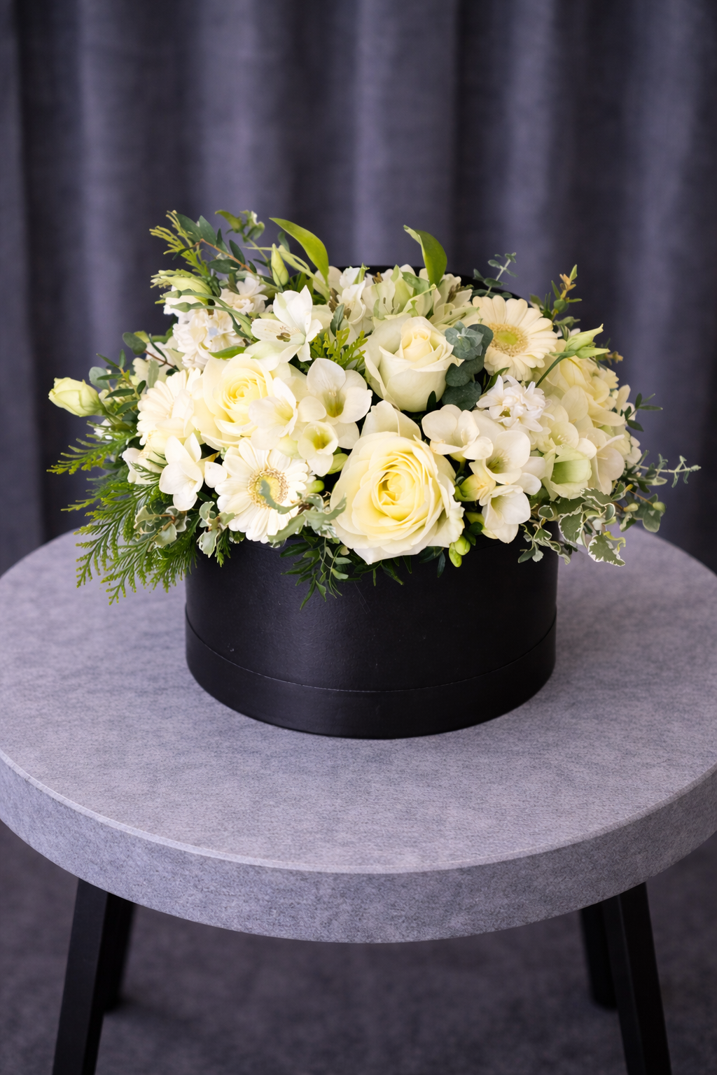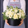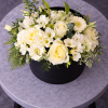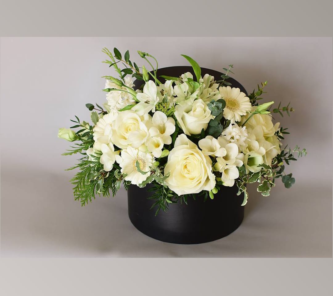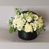 Aranjament Floral Elegant cu Trandafiri Albi în Cutie Neagră este o compoziție florală rafinată, realizată din flori albe delicate, care transmit eleganță, puritate și stil. Acest aranjament floral este ideal pentru cadouri speciale, aniversări sau evenimente elegante, fiind prezentat într-o cutie rotundă neagră modernă care pune în valoare frumusețea florilor.