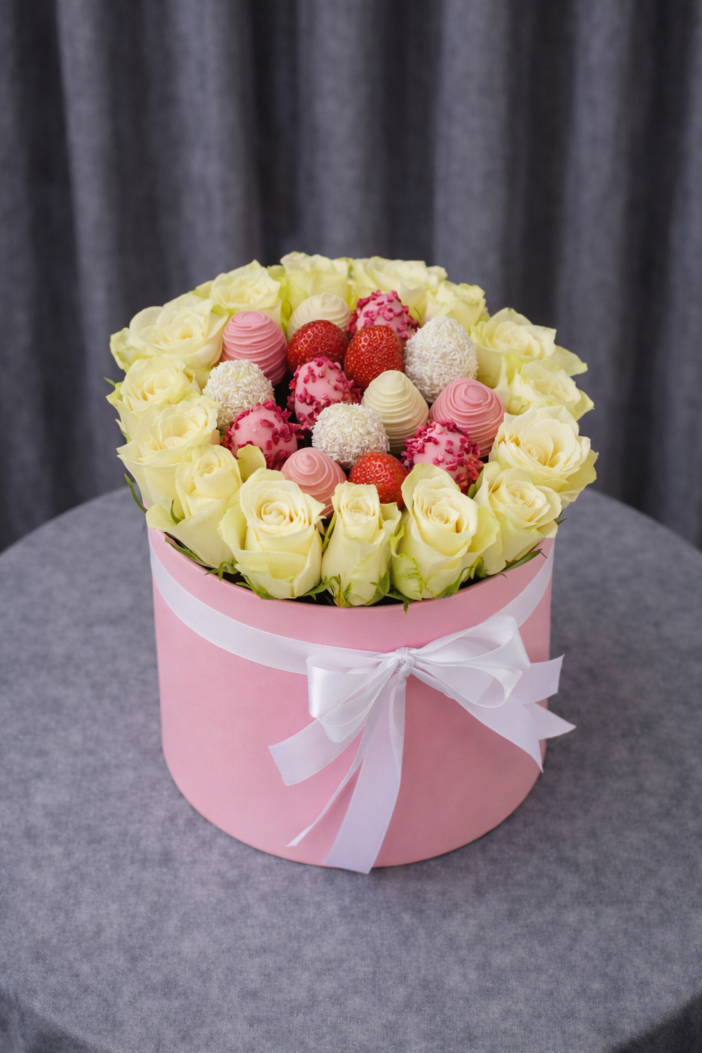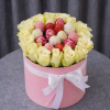 Aranjament floral premium în cutie roz rotundă, creat pentru momente elegante și cadouri memorabile.