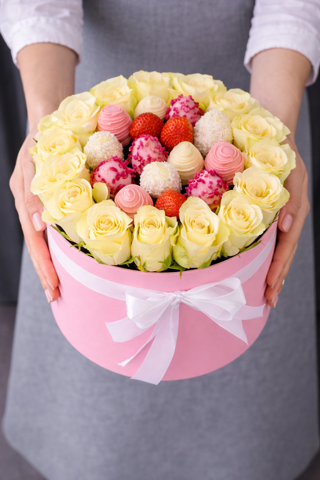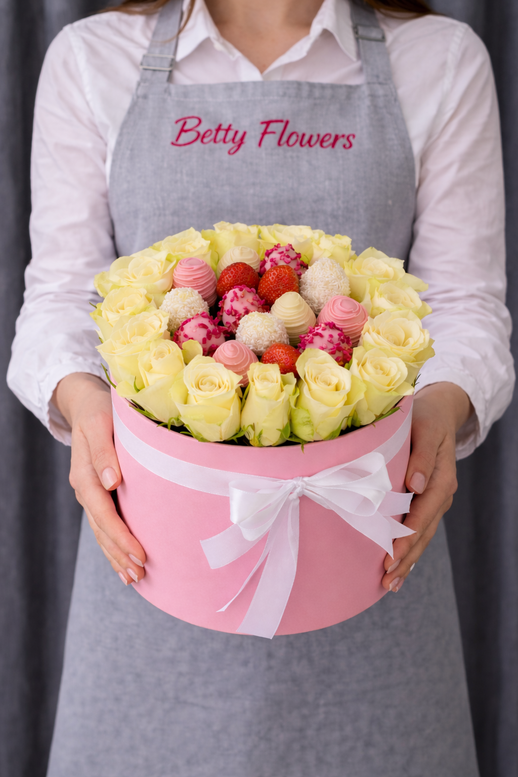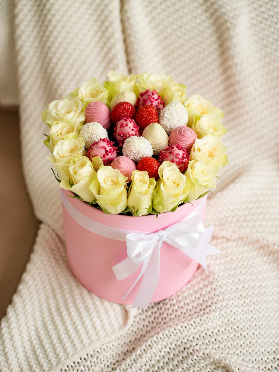 Căpșuni în ciocolată – 16 bucăți, decorate fin în ciocolată albă și roz, pentru un gust delicat și aspect sofisticat.