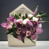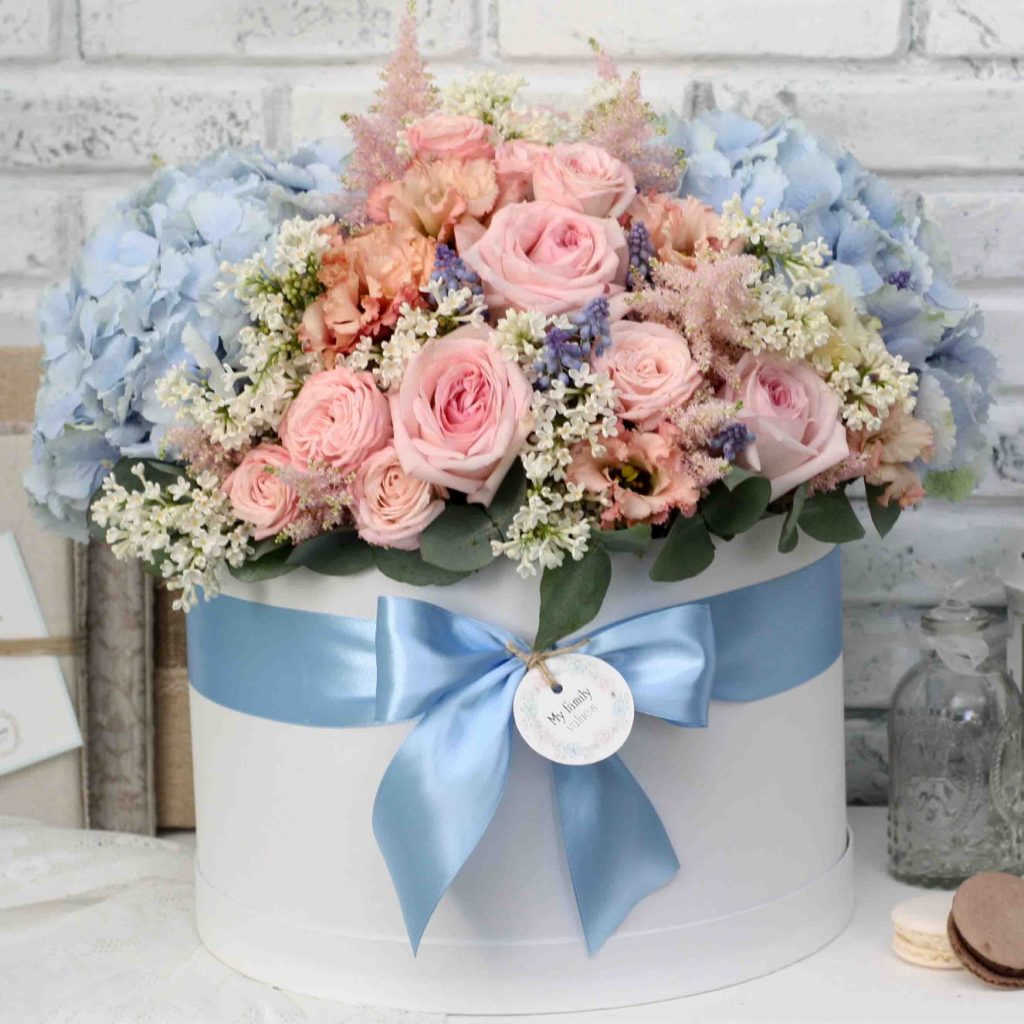 contine : hortenzii albastre , mini rose , lizianthus , trandafiri roz , astilbia roz, florile sunt asezate in cutie alba.
