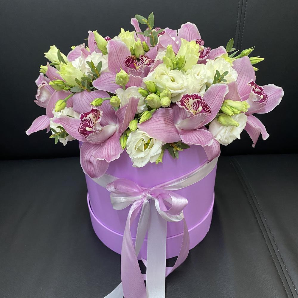 Mix de flori in cutie-Bujori,cumbidium,trandafir,limonium,bujori.