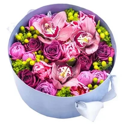 Contine: orhidee, cymbidium, tradafiri, hypericum, verdeata decorativa.