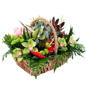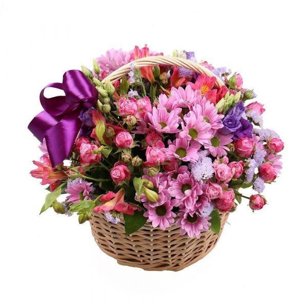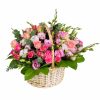 Pentru persoane mai sobre sau pe care merită să le privești cu stimă, alege aranjamentul floral „Flavia”, realizat din mine rose roz, crizanteme mov, lisianthus mov, viburnum, oxypetalum, astromerii, așezate într-un cos elegant, care îi oferă distincție.