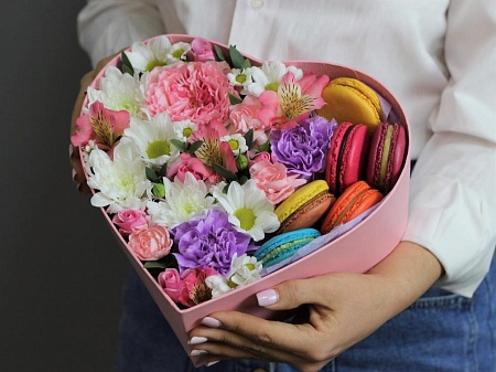 Aranjament floral cu flori si Macarons. |