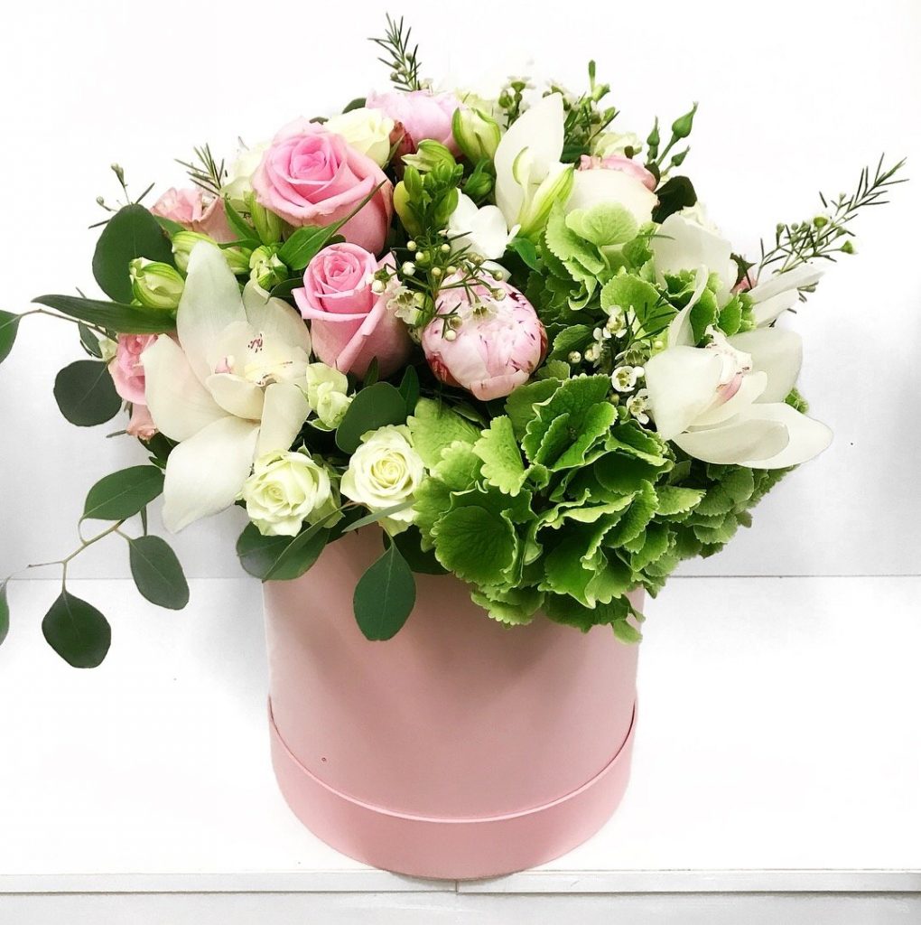 Culori complementare si texturi variate,asa am rezuma noi aranjamentu flori surprize care contine orhideie ,trandafiri,hortenzii si mine rose.