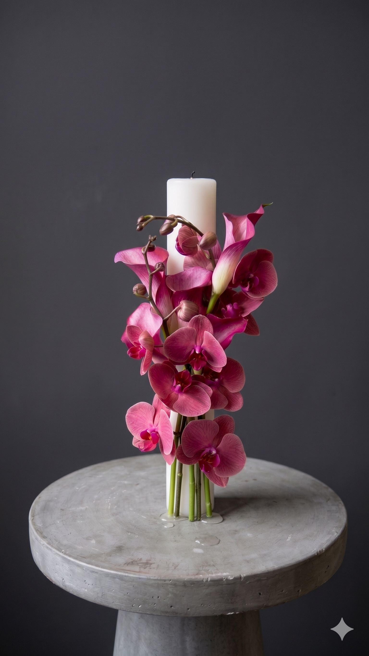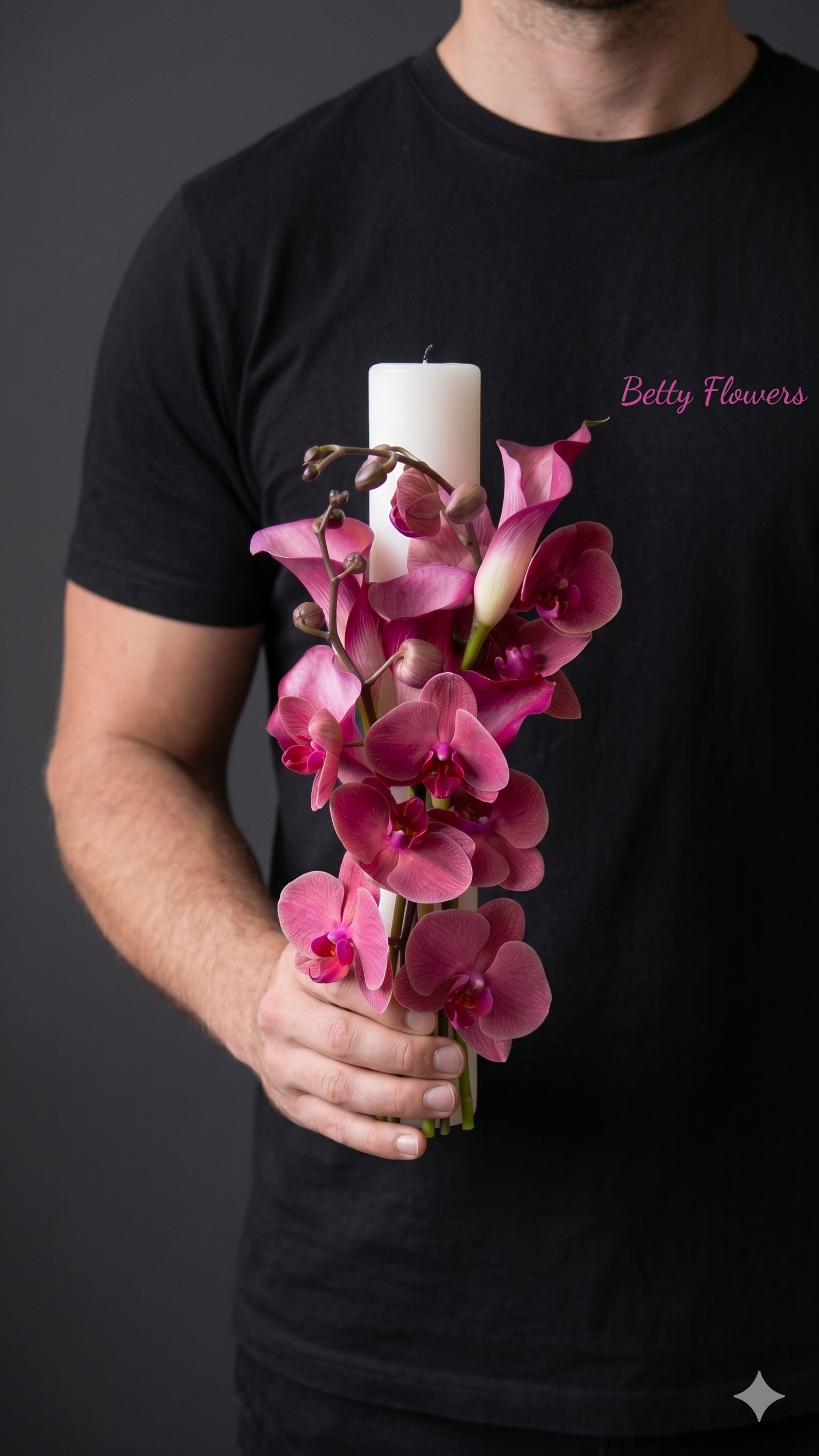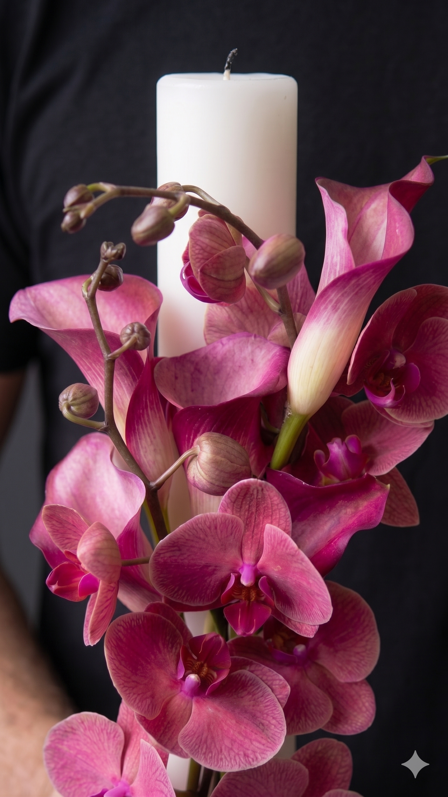 Lumânarea de cununie este unul dintre cele mai importante simboluri ale zilei nunții, reprezentând lumina și călătoria pe care o începeți împreună. La Betty Flowers, am creat un aranjament floral distinctiv, unde eleganța orhideelor se întâlnește cu rafinamentul florilor de calla, într-o nuanță vibrantă de ciclam (magenta), menită să atragă toate privirile.