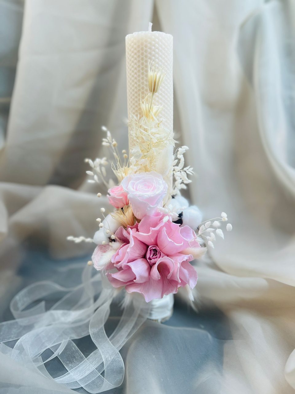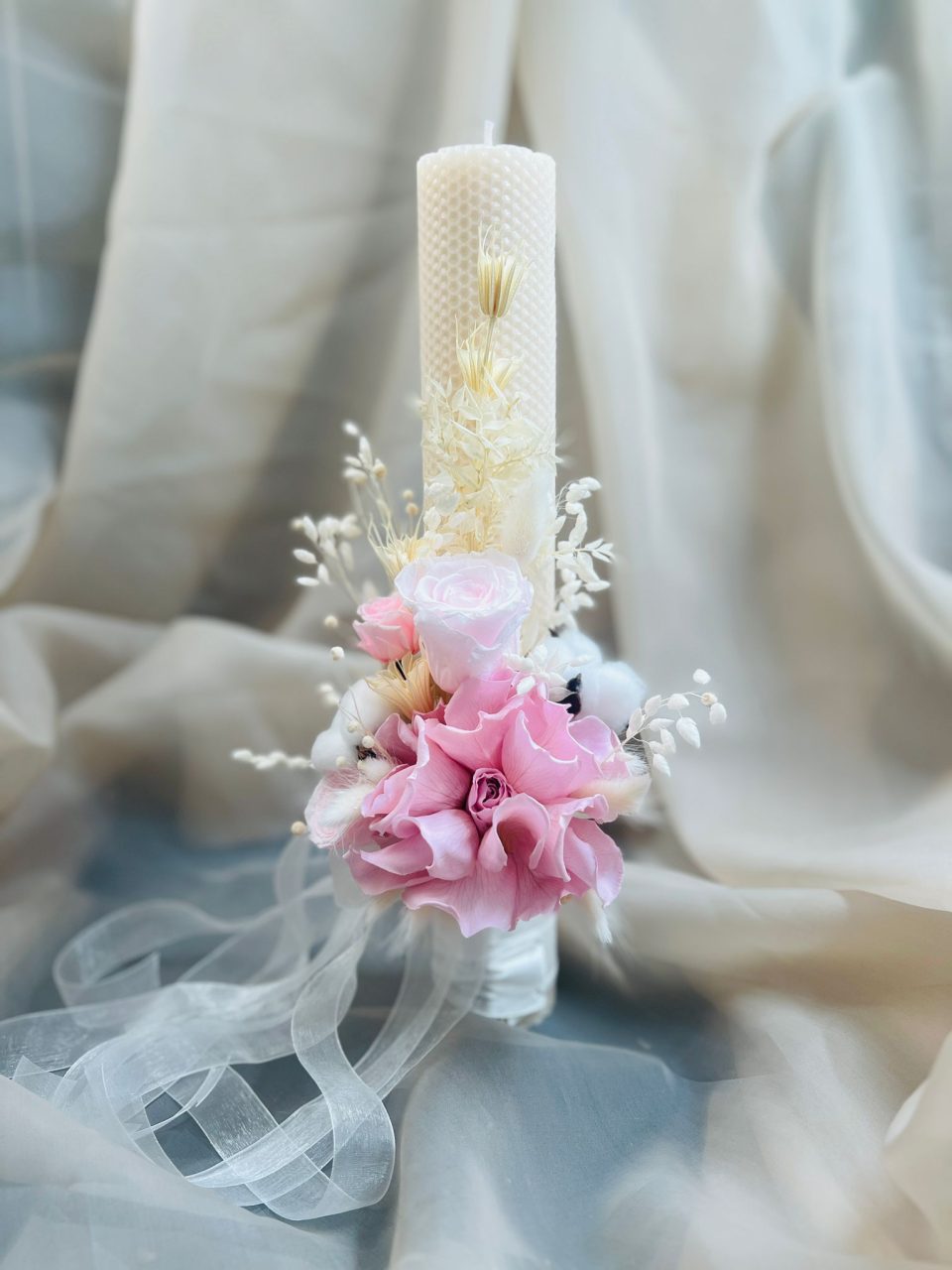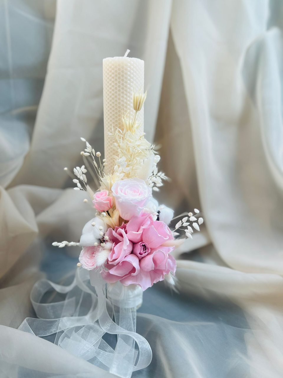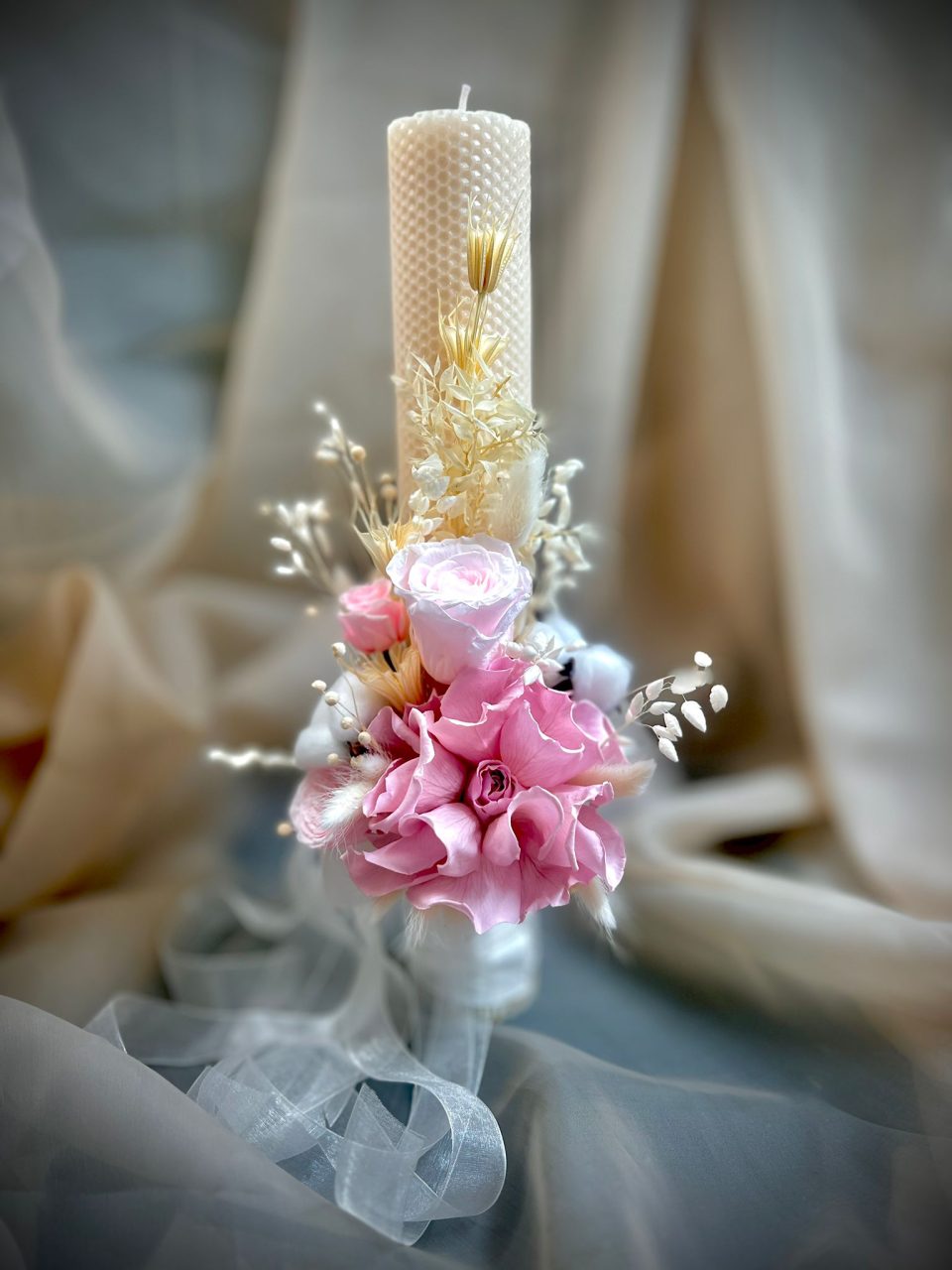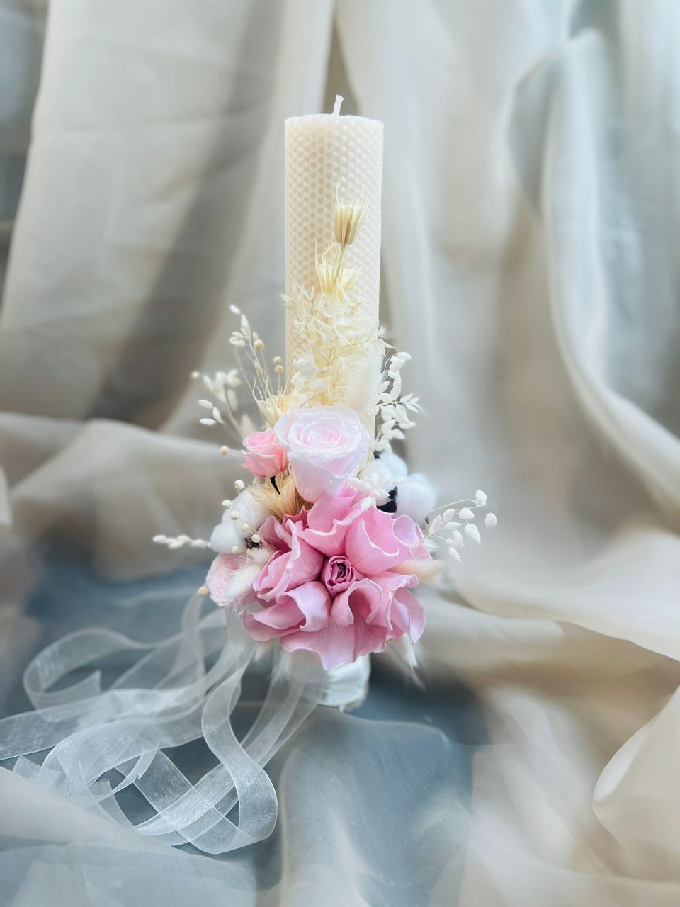 Îmbogățiți ceremonia dumneavoastră de cununie cu aceste lumanări spectaculoase, realizate din flori criogenate, care aduc un plus de eleganță și rafinament. Fiecare lumanare, cu o înălțime de 40 cm și design tip fagure, este decorată cu flori delicate care aduc un aer romantic oricărei eveniment.
