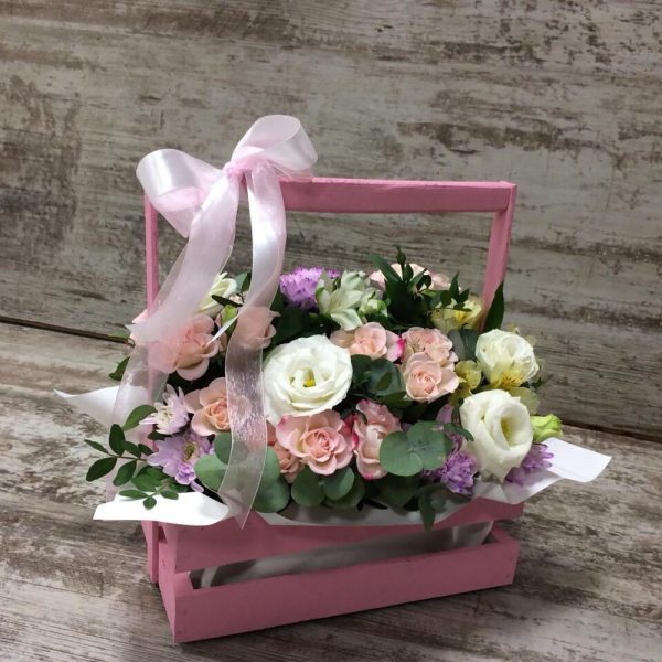 Contine: 5 fire de mini-rose roz, 3 fire de lyshiantus alb, 3 fire de crizantema roz, 5 fire de astromerie alba, verdeata decorativa.