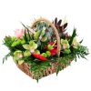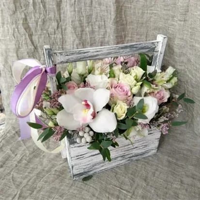 Contine:1 fir de cymbidium, 2 fire de lyshiantus, 3 fire de mini-rose alba, 3 fire de brumie, 5 fire de trandafiri roz, 3 fire de astromerii albe, verdeata decorativa.