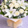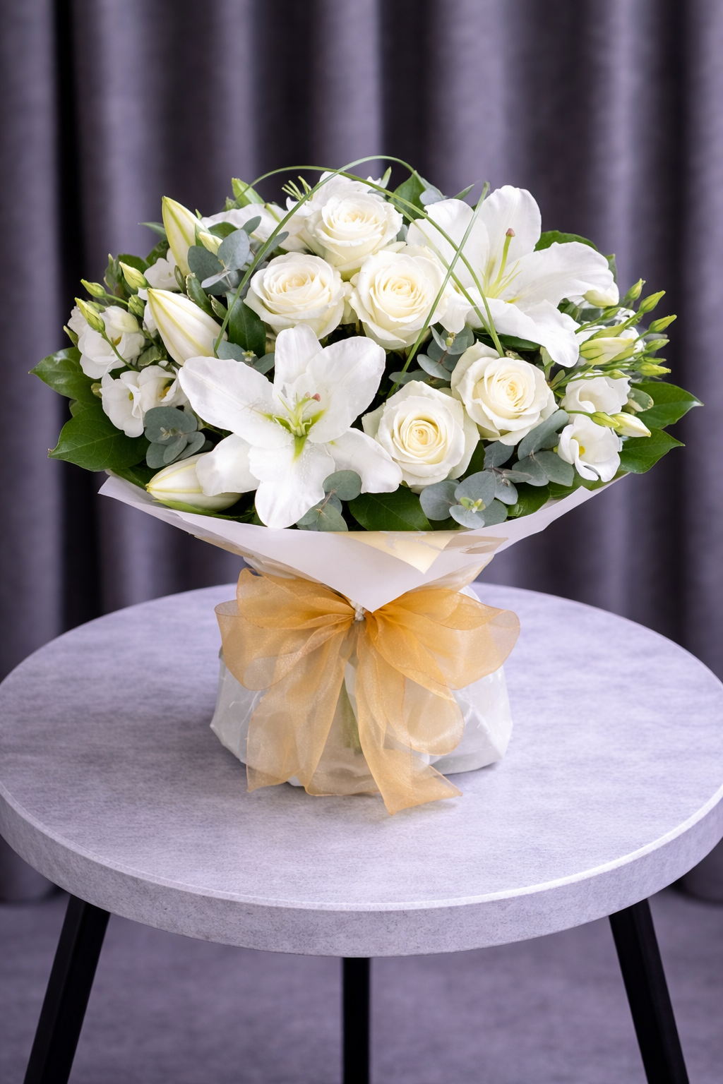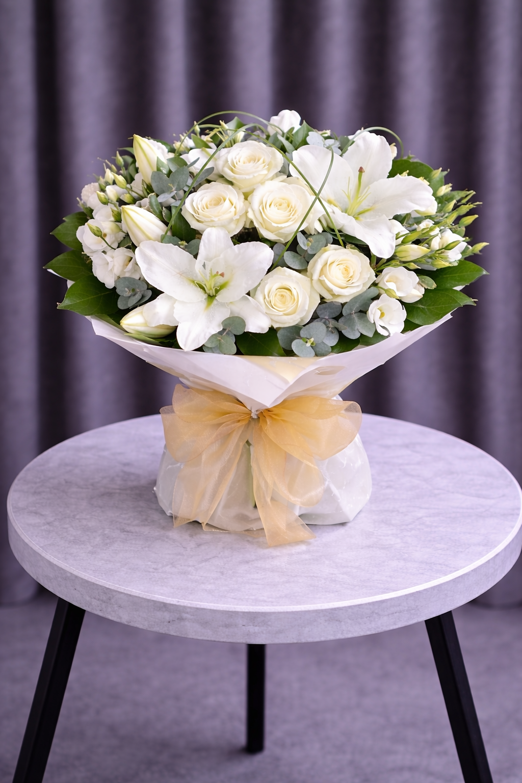 Trandafiri albi – 10 fire, baza acestui buchet elegant de flori albe, care oferă rafinament și un aspect premium. Trandafirii albi sunt printre cele mai căutate flori pentru buchete elegante și cadouri speciale.