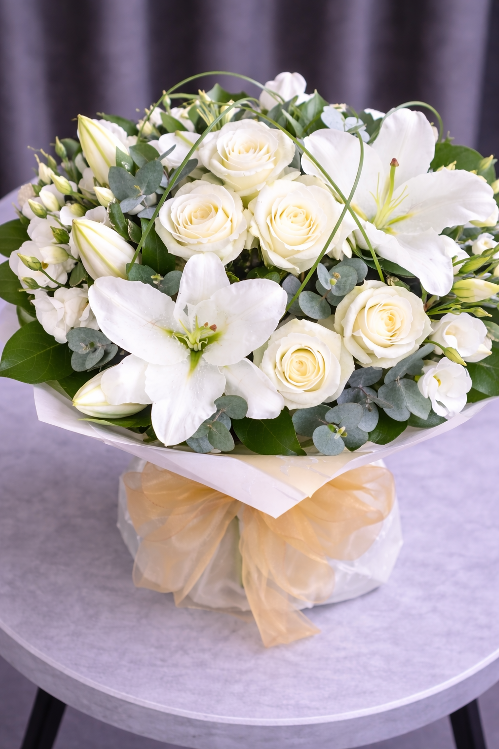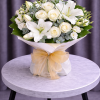 Lisianthus alb – 9 fire, flori delicate care completează perfect buchetul de trandafiri albi, adăugând volum și un stil floral romantic.