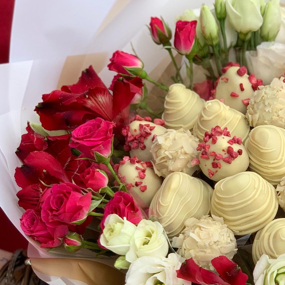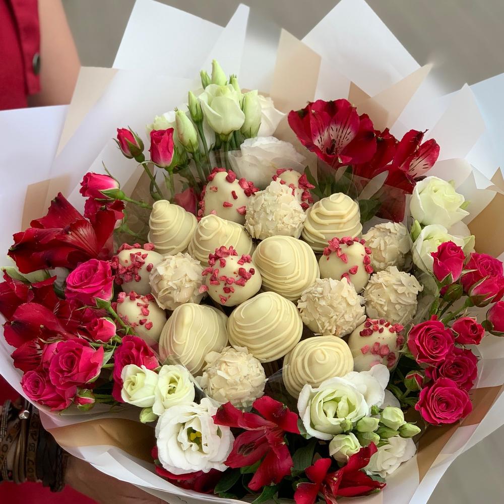 Buchet cu 20 Căpșuni în Ciocolată Albă Belgiană și Flori Naturale
