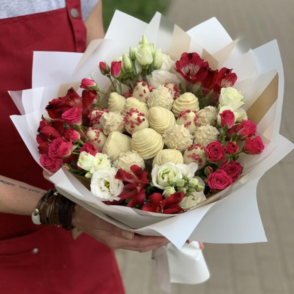 Un aranjament elegant ce combină 20 de căpșuni proaspete, glazurate manual în ciocolată albă belgiană, cu flori naturale atent alese. Cadoul perfect pentru momente speciale, aniversări sau surprize romantice.