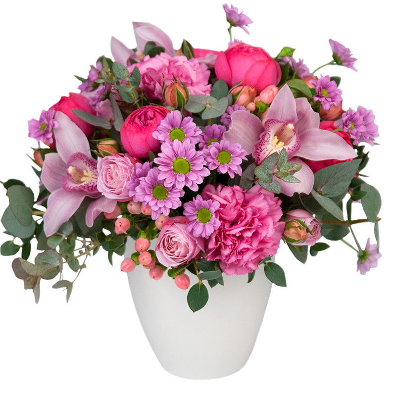 Asociate cu regalitatea, florile mov reprezintă eleganța, dar și emoțiile intense. Alături de trandafirii roz orhideele mov alcătuiesc un aranjament floral plin de farmec. Florile sunt aranjate întrun vas ceramic personalizată și aranjamenteul poate fi oferit cu orice ocazie. Oferă acest aranjament cu cu orice ocazie și sigur va aduce bucurie.
