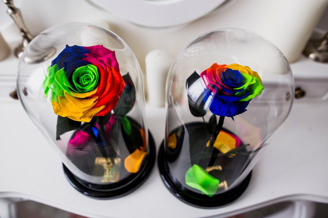 Aranjament cu trandafiri criogenati multicolori, un cadou elegant, care simbolizeaza devotament si dragoste profunda.